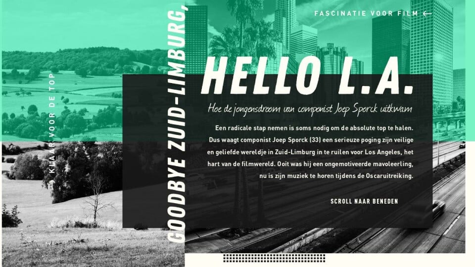Een radicale stap nemen is soms nodig om de absolute top te halen. Dus waagt componist Joep Sporck (33) een serieuze poging zijn veilige en geliefde wereldje in Zuid-Limburg in te ruilen voor Los Angeles, het hart van de filmwereld. Ooit was hij een ongemotiveerde mavoleerling, nu is zijn muziek te horen tijdens de Oscaruitreiking.
